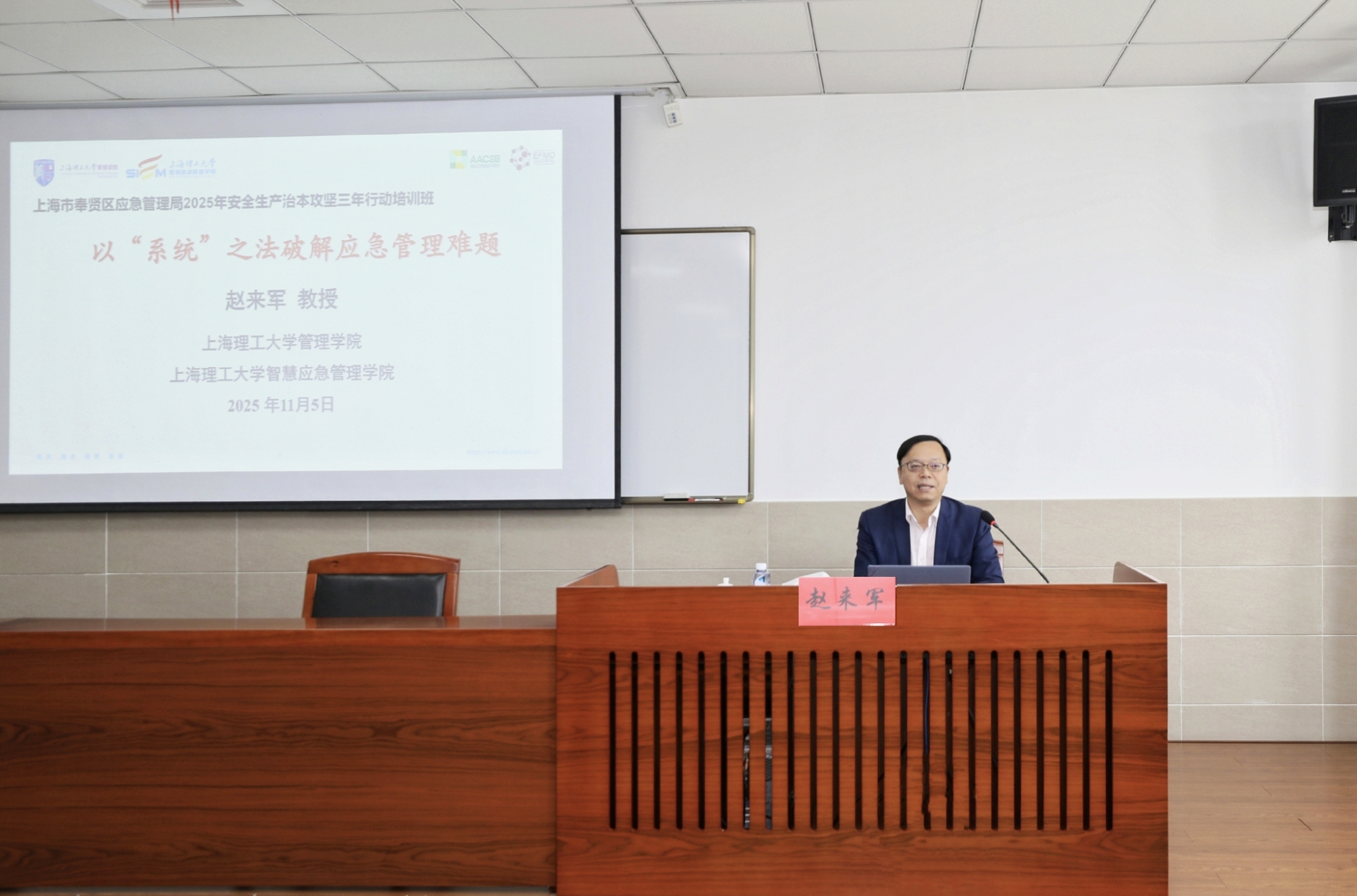 11月5日,上海理工大学管理学院院长、智慧应急管理学院执行院长赵来军教授应邀为奉贤区应急管理局“2025年安全生产治本攻坚三年行动培训班”授课,作题为“以‘系统’之法破解应急管理难题”的专题报告。奉贤区应急管理局党委副书记、副局长叶敏等局领导、各业务科室负责人,以及各街镇、相关公司安监部门负责人和业务骨干等60余人参加了此次培训。